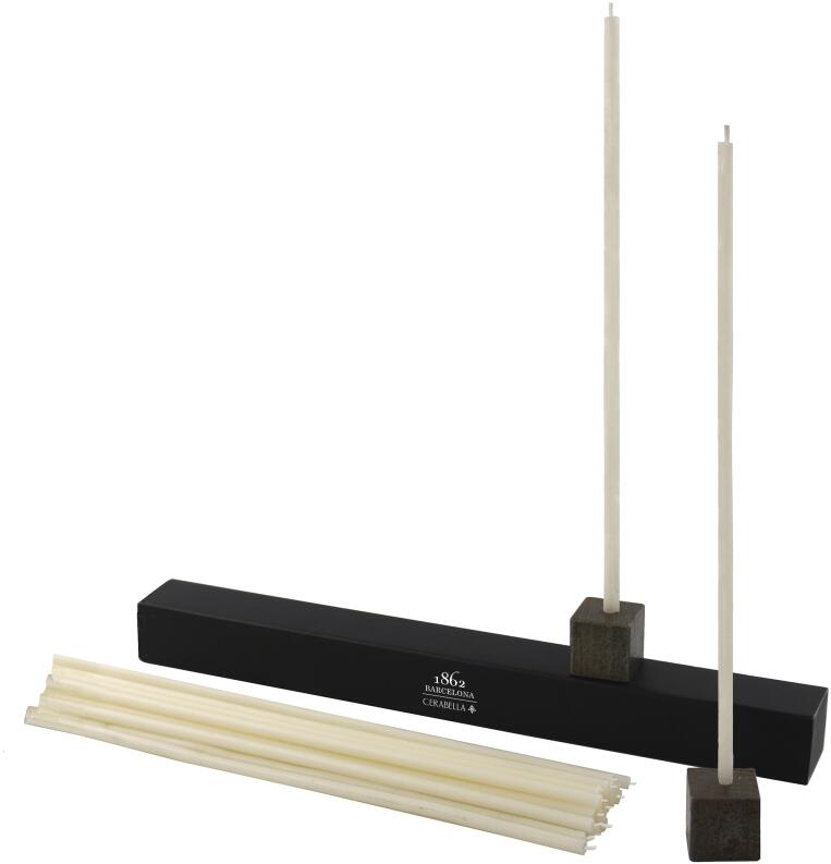 In jedem Set sind 20 Kerzen 0,5 x 24 cm und zwei würfelförmigen Kerzenständern aus Eisen. Verpackt in einer raffinierten schwarzen Schachtel, die sich sehr gut als Geschenkbox eignet.
